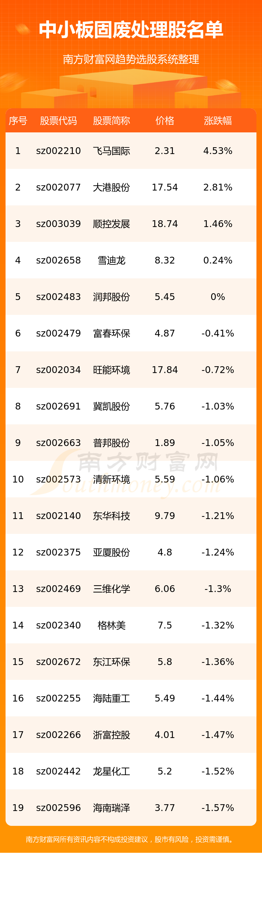 截至4月4日,中小板固废处理股有飞马国际、大港股份、顺控发展、雪迪龙、润邦股份、富春环保、旺能环境、冀凯股份、普邦股份、清新环境等29家。以下是《根据市场行情综合分析后趋势选股系统》为您整理的中小板固废处理股的详细介绍。