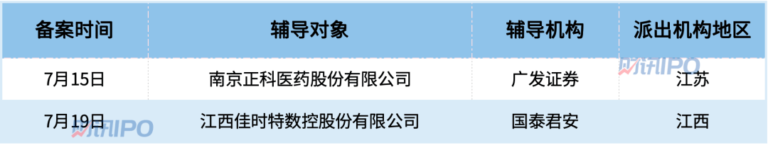 据统计,7月15日至7月21日,新增辅导备案企业2家,为南京正科医药股份有限公司(以下简称“正科医药”)、江西佳时特数控股份有限公司(以下简称“佳时特”)。