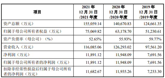 2018年—2021年,金源装备分别实现营业收入7.77亿元、9.76亿元、12.63亿元、11.61亿元,净利润分别为0.59亿元、0.77亿元、1.19亿元、1.19亿元,扣非后归母净利润分别为0.54亿元、0.72亿元、1.19亿元、1.17亿元。