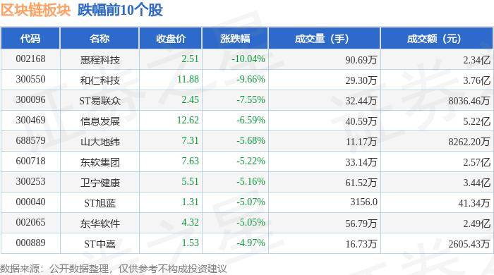 证券之星消息,7月24日区块链板块较上一交易日下跌1.48%,惠程科技领跌。当日上证指数报收于2901.95,下跌0.46%。深证成指报收于8493.1,下跌1.32%。区块链板块个股涨跌见下表: