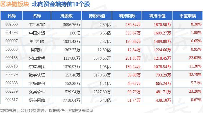 北向资金方面,当日区块链板块北向资金持股市值为465.61亿元,减持4.13亿元。其中增持最多的是TCL智家,增持了0.19亿元。减持持最多的是东方财富,减持了1.82亿元。区块链板块北向资金持股变动明细见下表: