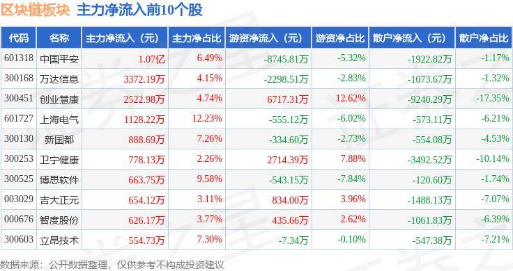 从资金流向上来看,当日区块链板块主力资金净流出11.06亿元,游资资金净流入3971.95万元,散户资金净流入10.66亿元。区块链板块个股资金流向见下表: