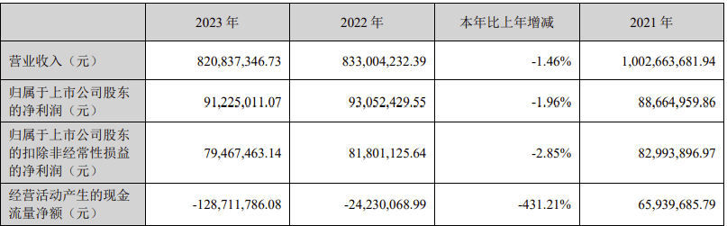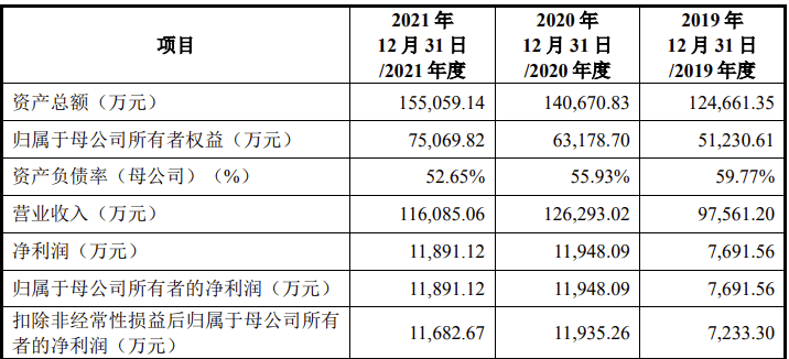 2019年、2020年、2021年,公司实现营业收入分别为9.76亿元、12.63亿元、11.61亿元,扣非归母净利润分别为0.72亿元、1.19亿元、1.17亿元。2021年营收、净利润同比略有下降。