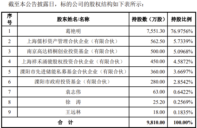 标的公司共有9名股东,包括5家合伙企业,4名自然人,其中葛艳明先生持股76.9756%。