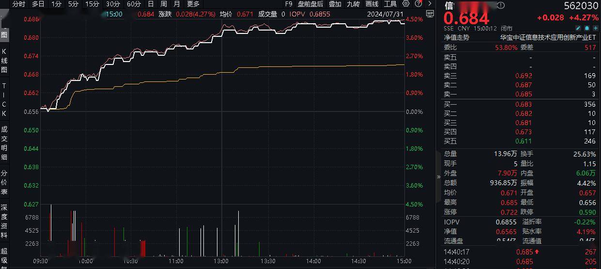 热门ETF方面,重仓软件开发行业的信创ETF基金(562030)高歌猛进,分时图甩出漂亮的上行走势,场内价格最高上探4.42%,收涨4.27%,一举收复5日、10日、20日均线。