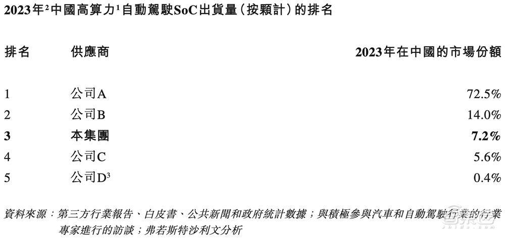 根据弗若斯特沙利文的报告,2023年,中国高算力(50+ TOPS)自动驾驶SoC出货量达到150万颗,按出货量计,黑芝麻智能是第三大供应商,在中国的市场份额达到7.2%。