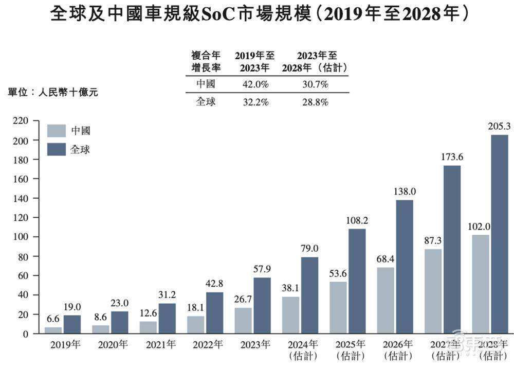 车规级SoC及解决方案行业竞争激烈。根据弗若斯特沙利文的资料,全球车规级SoC市场预计将由2023年的579亿元增长至2028年的2053亿元,期内复合年增长率为28.8%;基于SoC的智能道路解决方案的全球市场规模预计于2026年将达到152亿元,于2030年将进一步达到398亿元。