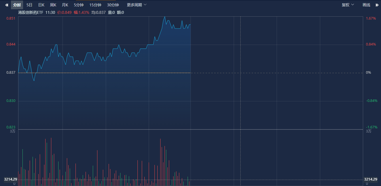 8月8日,港股创新药板块领跑港股市场。相关ETF方面,截至午间收盘,紧密跟踪港股通创新药指数的港股创新药ETF(159567)上涨1.43%,成交额超7400万元,换手率达43%,早盘交投活跃。