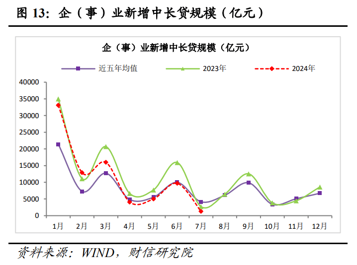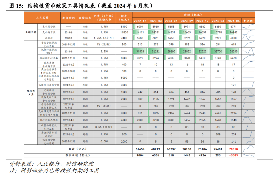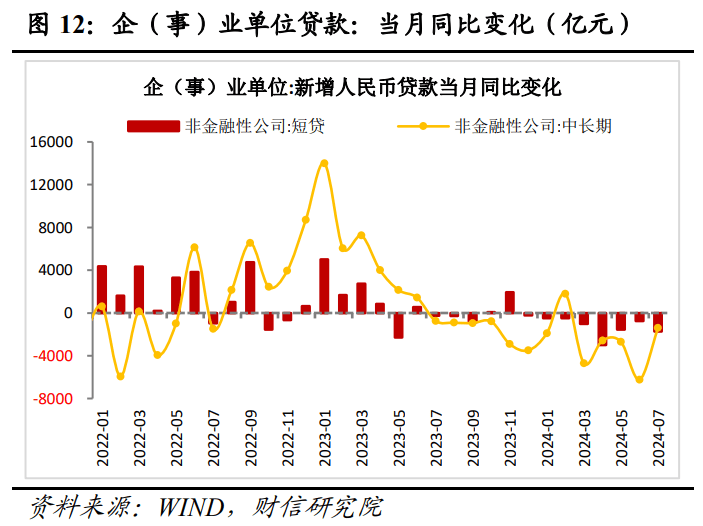 (一)企(事)业端:票据融资继续冲量,短贷和中长贷延续低迷。7月份,企(事)业单位新增贷款1300亿元,同比少增1078亿元,其中受益于银行放松融资条件、适当降低票据利率的影响,票据融资额达5586亿元,同比多增1989亿元,冲量迹象明显;同期企业新增短贷和中长贷分别同比少增1715、1412亿元(见图11-12),过去13个月中前者有11个月、后者有12个月同比少增。企(事)业短贷、中长贷同比持续少增(见图12-13),原因主要有四:一是叫停“手工补息”后,部分企业“低贷高存”资金套利行为得到纠正,导致部分贷款被提前偿还;同时政策引导淡化信贷“规模情结”,均会起到一定“挤水分”效应,持续对企业贷款形成负面冲击。二是过去两年支撑企(事)业贷款尤其是企(事)业中长贷维持强劲的低碳高技术相关结构性货币政策工具已部分到期(见图15),对相关信贷的带动作用有所弱化。今年4月份央行再度设立5000亿元科技创新和技术改造再贷款,5月份创设3000亿元保障性住房再贷款,但政策显效还存在一定时滞,截至6月末两者合计仅使用121亿元。三是今年二季度PSL抵押贷款规模收缩约5500亿元,将导致相关信贷有所减少。四是当前实体需求不足问题依旧突出,尤其是地产下行趋势未改、民营企业增加资本开支意愿不足,均对企业信贷形成一定制约。