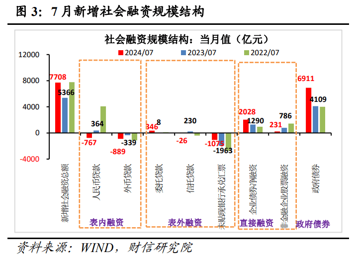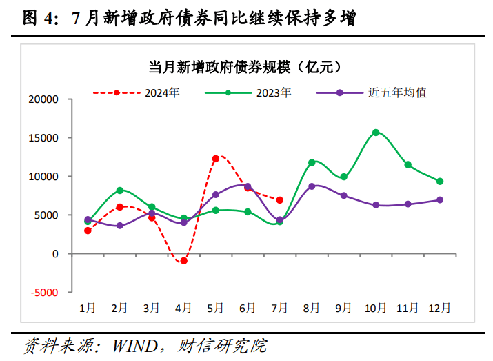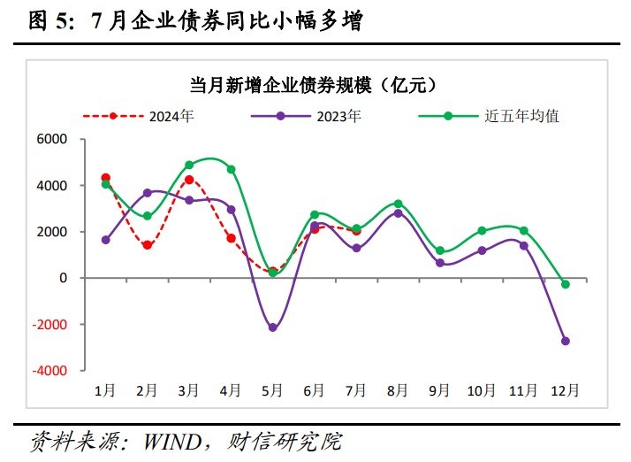 (一)政府债券、表外融资和企业债券,共同支撑社融低位企稳。一是受益于财政加快发力推动超长期特别国债、专项债发行提速和去年同期低基数的影响,政府债券净融资额同比多增2802亿元(见图3-4),为本月社融同比多增额的约1.2倍,是最主要的支撑因素。二是表外融资额同比少减少970亿元,也对社融形成一定助力。其中,未贴现的银行承兑汇票、委托贷款分别同比少减少1356亿元和同比多增338亿元,为主要贡献力量(见图3),或主要与银行放松融资条件和上半年上述贷款投放偏弱基数较低等因素相关;其他分项信托贷款净融资额转负,结束连续十个月的正增长,同比减少256亿元,或主要源于近期监管部门加强窗口指导,严控城投平台非标融资。三是受债券发行利率下行较多、去年同期基数偏低等因素的影响,企业债券净融资额同比多增738亿元(见图5),也有利于社融的改善。但在地方政府隐性债务“扼增化存”的政策基调下,年初以来城投债净融资延续“减量”态势,6-7月份其净融资虽轻微回正但仍大幅低于历史同期水平(见图6),持续对企业债融资形成重要拖累。预计下半年该“减量”趋势大概率还会延续,政府优化债券结构、地方政府化解隐性债务或对全年企业债融资规模形成一定负面冲击。