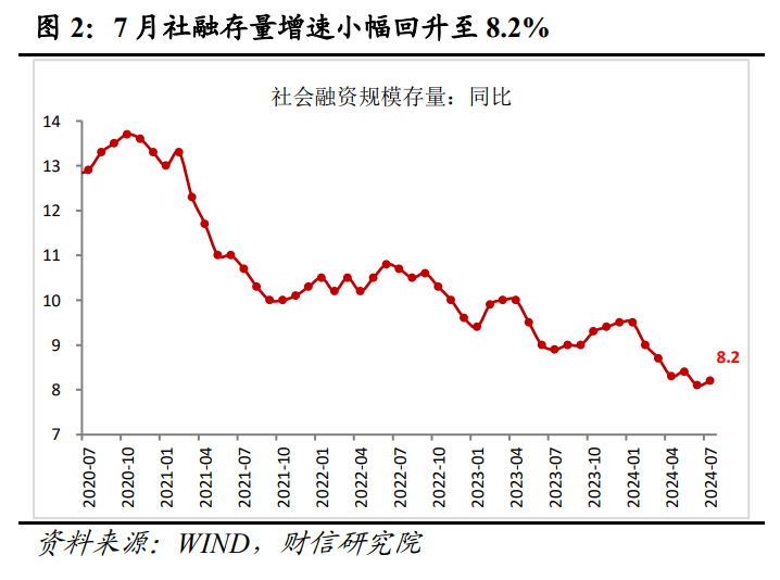 2024年7月份社融增量为7708亿元,同比增加2342亿元,但低于近五年历史同期均值约3000亿元(见图1);7月社融存量增速较上月提高0.1个百分点至8.2%(见图2),实体融资需求在低基数的支撑下小幅企稳。