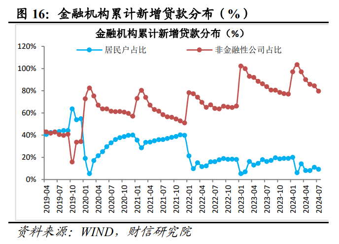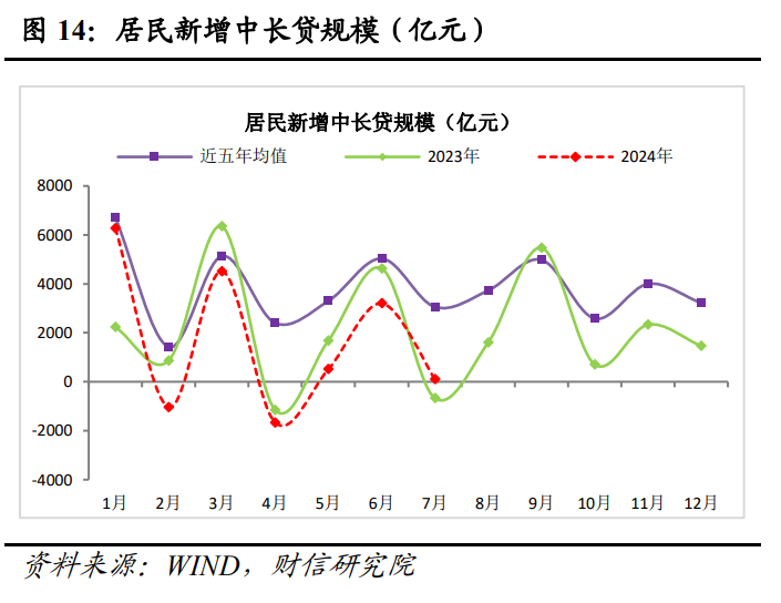 (二)居民端:短贷、中长贷疲弱态势未改,居民消费和购房需求依旧不足。7月份居民部门新增贷款-2100亿元,再度由正转负,同比多减少93亿元(见图10-11)。其中,居民短贷和中长贷分别同比减少821和增加772亿元,前者连续6个月同比少增,后者虽受低基数的影响同比微增,但绝对规模仅100亿元(见图14),反映出消费、地产需求持续偏弱,部分居民仍在提前还款,居民资产负债行为的收缩和预期亟待提振。具体看,居民中长贷的低迷(见图14),一方面反映出新出台的一揽子房地产刺激政策落地效果有限,另一方面也表明在房地产市场供需关系发生重大变化的背景下,各种限制性政策早已“不合时宜”,应该“走在市场曲线前面”,进一步加大政策刺激力度。预计房地产仍处于深度调整后的筑底阶段,从数据来看,7月30大中城市商品房成交面积同比下降16.5%,自2021年6月份以来的38个月中有34个月为负增长,百城二手房房价亦仍未止跌。居民短贷持续偏弱,1-7月累计新增608亿元,同比少增1.13亿元,不足2020年疫情爆发时同期水平的一成,表明当前居民行为和预期已发生重大变化,信贷需求受“就业-收入-消费”循环恢复和居民预期均偏弱的制约偏强。财政政策在刺激企业端的同时,支持居民端需求方面可以有更大作为,畅通内循环,以稳增长、提通胀、增收入。