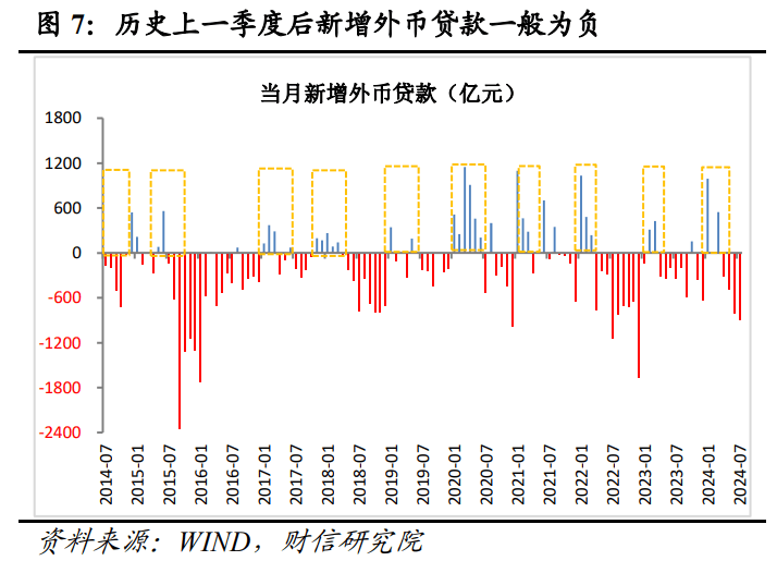 (二)新增人民币贷款转负、股票融资低迷,持续对社融形成重要拖累。一方面,受实体有效融资需求依旧不足、金融数据“挤水分”效果持续显现和“资产荒”下微观主体提前还款等多重因素的影响,7月新增人民币贷款(社融口径,即对实体经济发放的人民币贷款)为-767亿元(见图3),创下有统计数据以来的历史最低水平,拖累作用突出。另一方面,受IPO、再融资政策持续偏紧和资本市场成交低迷等的影响,非金融企业股票融资额仅231亿元,同比减少555亿元(见图3),过去22个月中有20个月同比少增。此外,本月新增外币贷款-889亿元,同比多减少550亿元,或主要与外币贷款利率偏高、外币融资需求偏弱以及季节性规律相关,如受从事国际贸易企业或外商投资企业的贸易结算需求或投资需求增加的影响,历史上年初新增外币贷款一般为正,之后转负(见图7)。