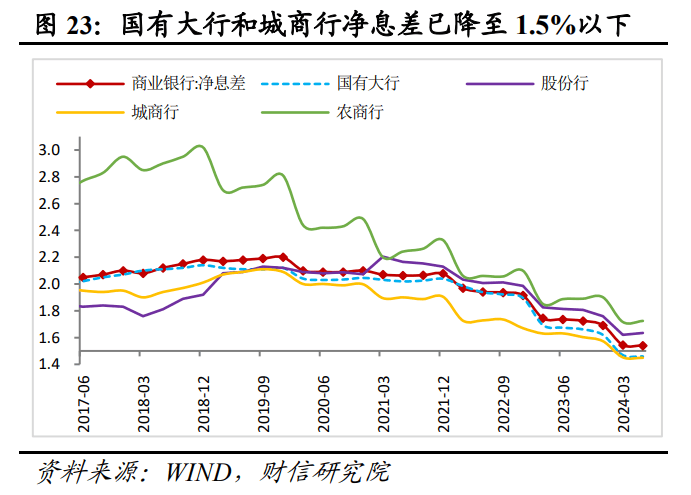 一是流动性方面,未来降准的概率或依旧不低。其一,配合财政政策发力的需要。未来政府债券发行速度将明显加快,且不排除还会有增发国债等新的增量财政政策出台,为避免由此带来的短期流动性紧张和利率波动过大,央行降准给银行释放长期低成本资金的概率仍大。其二,缓解银行资本约束和息差约束的需要。二季度国内商业银行净息差已降至1.54%,国有大行净息差已跌破1.5%的盈亏平衡点且继续下探(见图23),既不利于银行通过内源性融资补充资本金,也会抑制其投放信贷的能力与意愿。为增强对实体经济的支持力度、维护金融体系的稳定,降准缓解银行上述息差和资本约束的必要性偏强。