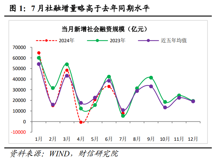 一是社融方面,财政加快发力与低基数,支撑社融低位企稳。7月社融同比多增2342亿元,但低于近五年历史同期均值约3000亿元,实体融资需求在低基数的支撑下小幅企稳。分结构看,政府债券同比多增额为全部社融的1.2倍,是最主要的支撑因素,表外融资、企业债券也均有所回暖;但新增人民币贷款(社融口径,即对实体经济发放的人民币贷款)转负,股票融资低迷,对社融持续形成拖累。受基数抬升、需求不足、政府债券支撑作用减弱等因素影响,预计未来社融增速趋稳仍面临一些挑战。