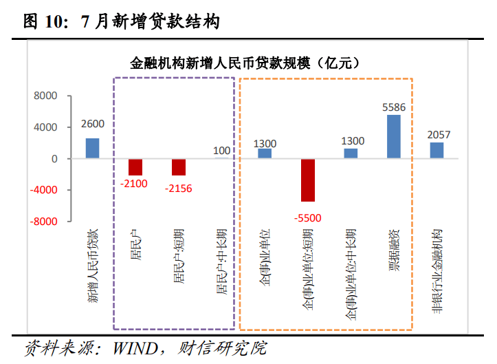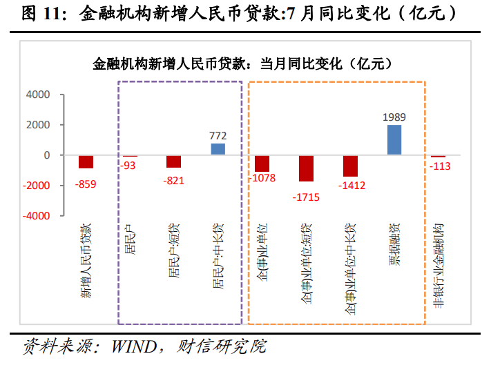 (三)1-7月累计数据显示居民、企业信贷需求收缩压力均突出。一方面,住户贷款占新增贷款的比重不足一成。1-7月份人民币贷款新增13.5万亿元,其中住户贷款仅增加1.25万亿元,占全部贷款的比重不足一成(见图16),表明居民信贷亟待提振。另一方面,企业贷款同比收缩约2万亿元。从同比变化看,1-7月居民短贷、企(事)业短贷、企(事)业中长贷分别减少11465、9015和17712亿元,三者对信贷增速的下拉作用均较为明显;同期票据融资同比增加约7000亿元,企业部门合计同比减少约2万亿元。
