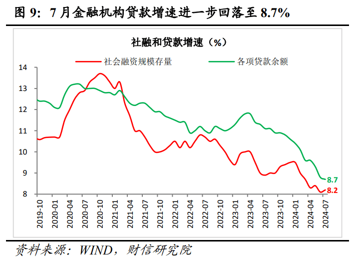 7月份金融机构新增人民币贷款2600亿元,在去年同期低基数的基础上,同比仍减少859亿元,不足近五年历史同期均值的1/4(见图8);各项贷款余额增速为8.7%,较上月回落0.1个百分点(见图9),延续2023年二季度以来的回落态势,表明实体信贷需求偏弱矛盾日益突出。同时信贷结构欠佳问题同样显著,如剔除非银金融贷款和票据融资冲量的影响后,7月居民短贷、中长贷和企(事)业单位短贷、中长贷合计新增规模为-6256亿元,创下历史最低水平,四者合计规模连续6个月同比少增。