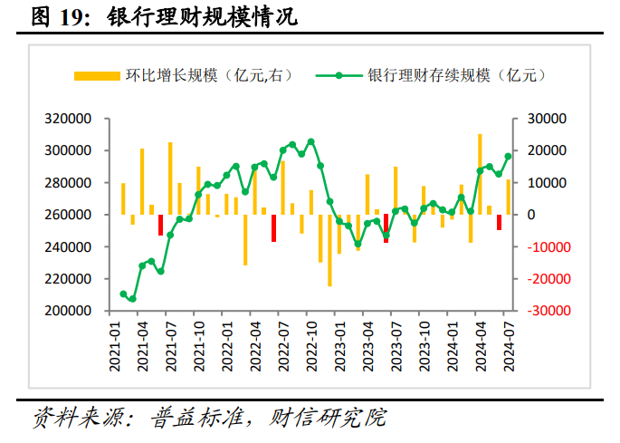 五是存款利率下行叠加债市火爆,导致存款阶段性搬家到银行理财。如根据普益标准的统计,截至7月末,国内银行理财产品存续规模约为29.6万亿元,较上月增加约1.1万亿元,但较去年末增加约3万亿元(见图19)。存款搬家银行理财,一方面源于叫停手工补息后,部分企业高息存款转向理财;另一方面也与今年债市火爆叠加存款利率下行,导致企业居民均主动将存款搬家至理财产品相关,今年以来不仅企业存款明显减少,1-7月份居民存款也已同比减少约2.2万亿元。