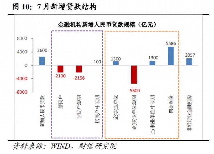 二是信贷方面,总量和结构持续欠佳,居民企业信用收缩压力加大。7月新增人民币贷款仅2600亿元,不足近五年历史同期均值的1/4,实体有效需求不足矛盾加剧。信贷结构欠佳问题同样显著,票据融资连续5个月同比多增冲量,剔除票据融资和非银金融贷款后,居民短贷、中长贷和企(事)业单位短贷、中长贷合计新增规模为-6256亿元,创下历史最低水平,四者合计规模连续6个月同比少增。这一方面与金融“挤水分”、PSL等结构性货币政策工具收缩等因素相关;另一方面主要仍源于微观主体行为模式转向谨慎,企业投资、居民消费购房意愿均较为低迷,有效需求不足问题加剧。为有效对冲私人部门需求收缩缺口、打破其资产、收入、支出”下降的负反馈循环(详见深度报告《破局需求不足负反馈循环》),超常规财政、货币政策出台有必要。