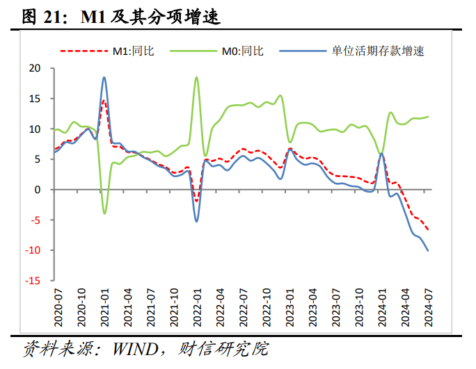 7月末M1同比增长-6.6%,降幅较上月扩大1.6个百分点(见图20),增速创历史新低,也是历史上首次连续四个月负增。从结构看,占M1比重超过80%的单位活期存款,其增速由上月的-8.0%扩大至-10.1%(见图21),是M1增速大幅下降的主要原因,同期M0增速反而较上月提高0.3个百分点至12%。