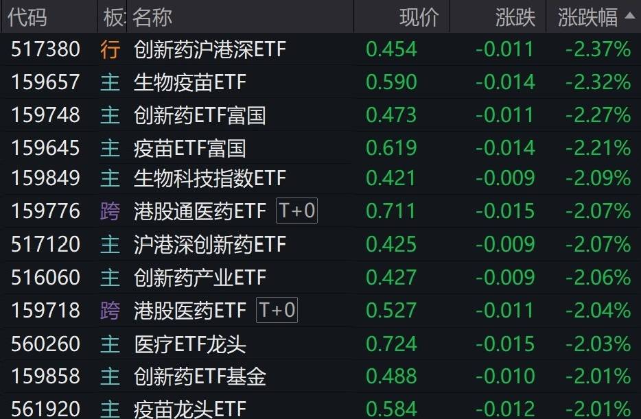 受盘面影响,多只创新药、疫苗等ETF跌逾2%。