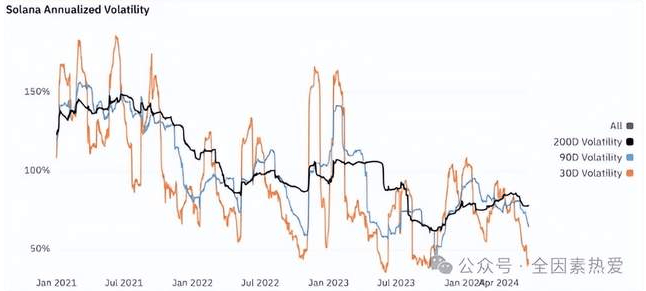 然而,低波动性意味着情况并非如此。对于 Solana 来说,200 天年化波动率为 77.80%。在过去 90 天中,波动率为 66.30%。