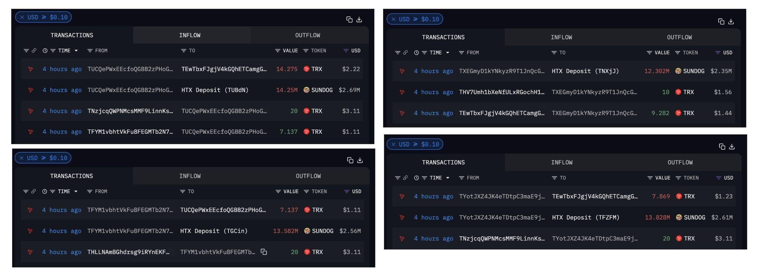 交易 $SUNDOG 6 天获利超 2000 万美元的「聪明钱」实际上通过三个地址在早期埋伏。四小时前,这些地址再次通过 4 个地址向 #HTX 充值了 5396 万枚代币,预计获利 1021 万美元。算一算,这三个地址累计获利金额已经超过 5000 万美元,简直比印钞机还厉害。