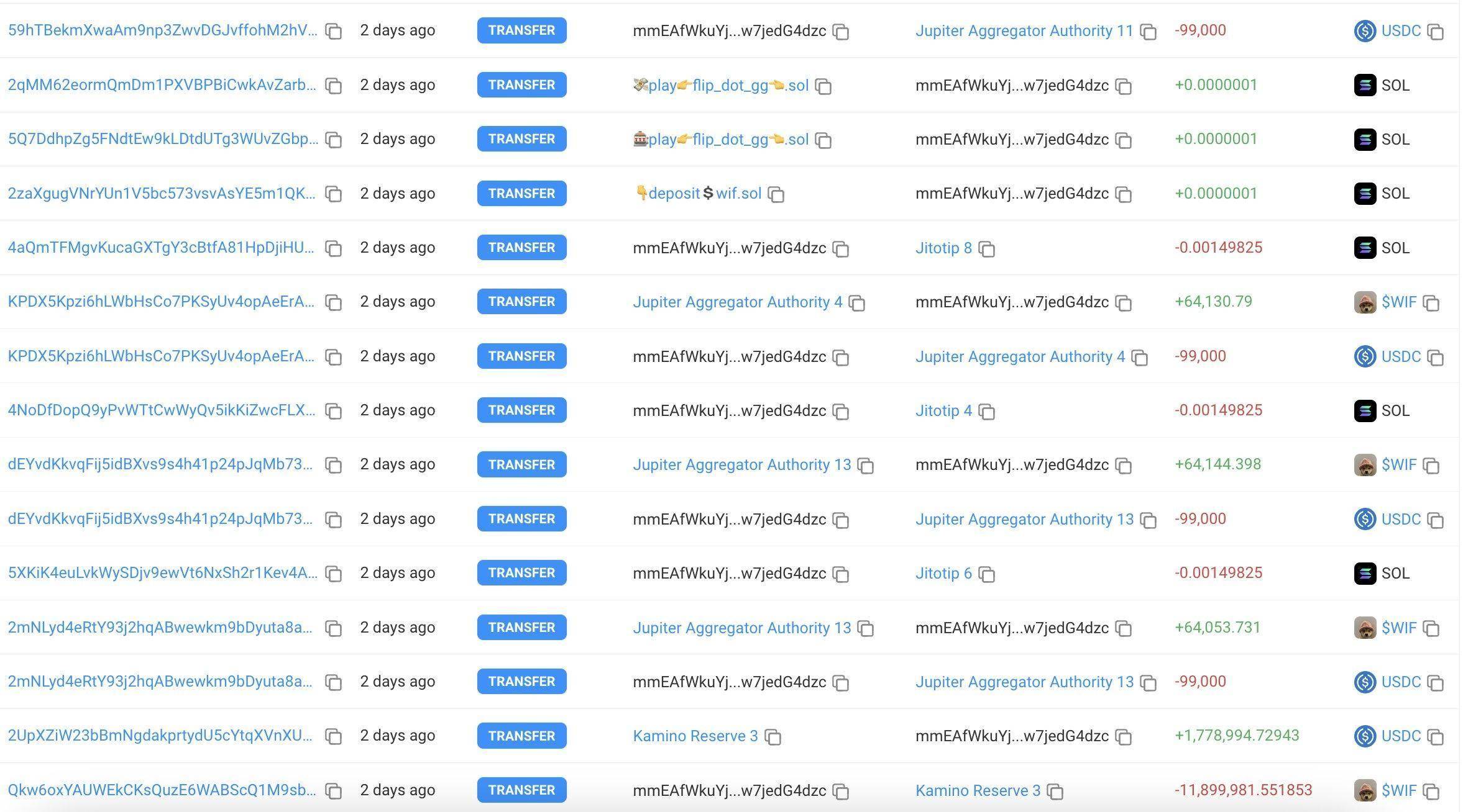 这名鲸鱼在2023年12月13日至12月15日期间,以每枚 $0.0114 的价格花费 22.6 万美元购买了 1986 万枚 $WIF,随后注册了 "binance-insider.sol" 域名,并在一次交易中花费 86,738 枚 $SOL(价值 892 万美元)购买了 1723 万枚 $WIF。