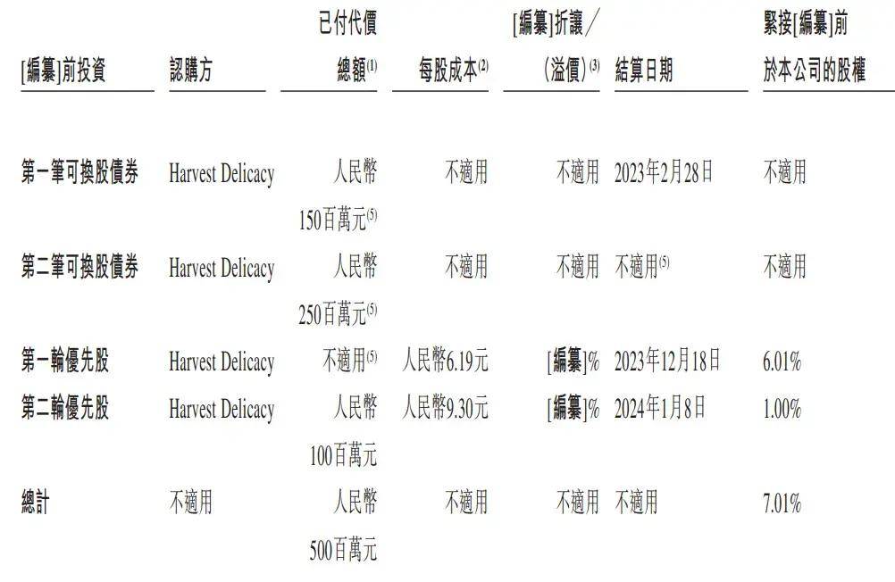 据此,HarvestDelicacy同意以4亿元的代价认购第一轮优先股,(其中包括)(i)第一笔可换股债券项下结算的金额1.5亿元的等值美元将用作认购242.19股第一轮优先股的代价,第一笔可换股债券向第一轮优先股的转换同时完成;及(ii)第二笔可换股债券项下的金额2.5亿元等值美元将用作认购403.66股第一轮优先股的代价,第二笔可换股债券同时被取消。上述交易完成后,Harvest Delicacy持有公司645.85股第一轮优先股。