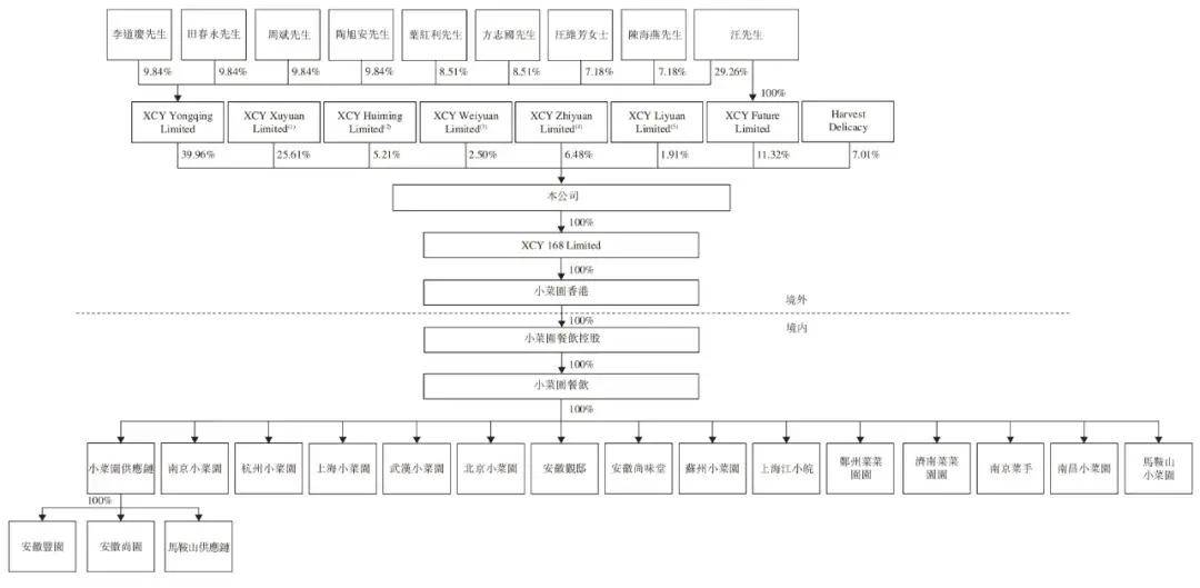 小菜园持股平台控制公司发行股本92.99%投票权,包括由XCY Yongqing Limited、XCY Xuyuan Limited、XCY Zhiyuan Limited、XCY Huiming Limited、XCY Weiyuan Limited、XCY Liyuan Limited及XCY Future Limited(统称英属维尔京群岛实体)分别持有公司已发行股本39.96%、25.61%、6.48%、5.21%、2.50%、1.91%及11.32%。