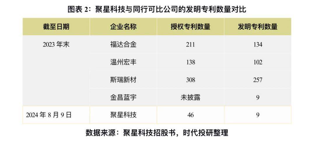 蹊跷的是,与高毛利率形成鲜明对比的是,聚星科技仅拥有9项发明专利,而温州宏丰和福达合金的发明专利数均超100项。