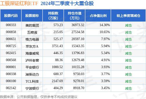 工银深证红利ETF为指数型-股票基金,根据最新一期基金季报显示,该基金资产配置:股票占净值比99.18%,无债券类资产,现金占净值比0.88%。基金十大重仓股如下: