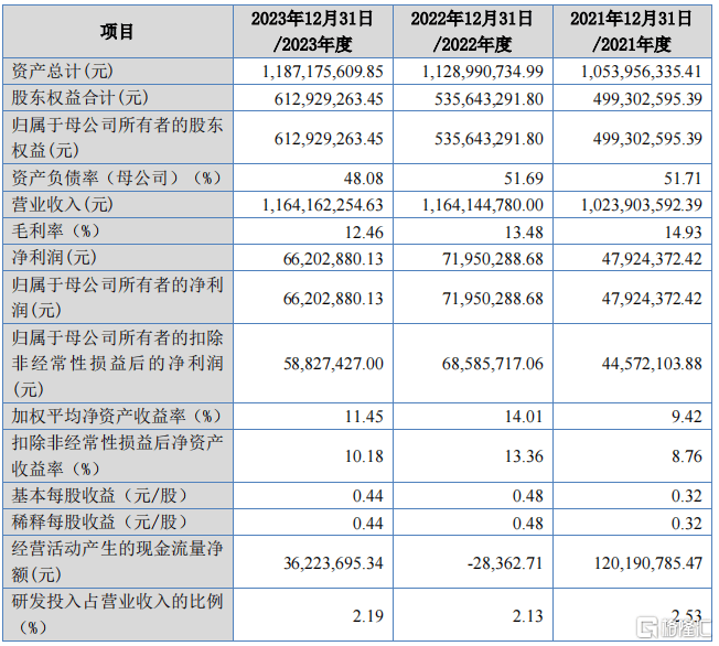 财务方面,2021年、2022年及2023年(简称“报告期”)公司营业收入分别为10.24亿元、11.64亿元、11.64亿元;同期归母净利润分别为4792.44万元、7195万元、6620万元。