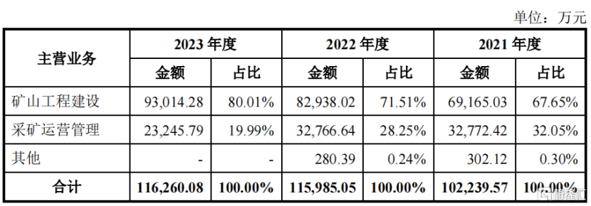 分业务来看,矿山工程建设服务占营收大头,且自2021年的67.65%提升至2023年的80.01%,同期采矿运营管理服务的占比由32.05%下降至19.99%。