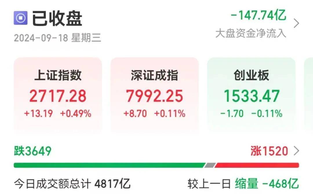 今天,全市场超3600只个股下跌。沪深两市成交额4793亿元,较上个交易日缩量454亿元, 创今年以来第三地量。 截至收盘,沪指涨0.49%,深成指涨0.11%,创业板指跌0.11%。