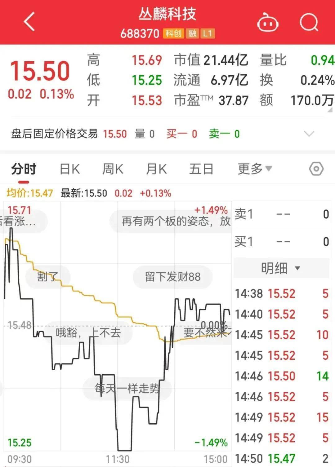 今天,科创板个股丛麟科技盘中出现13分钟之内零成交的情况 。 同花顺数据显示,午后13:02至13:14 ,该股交易量为0。