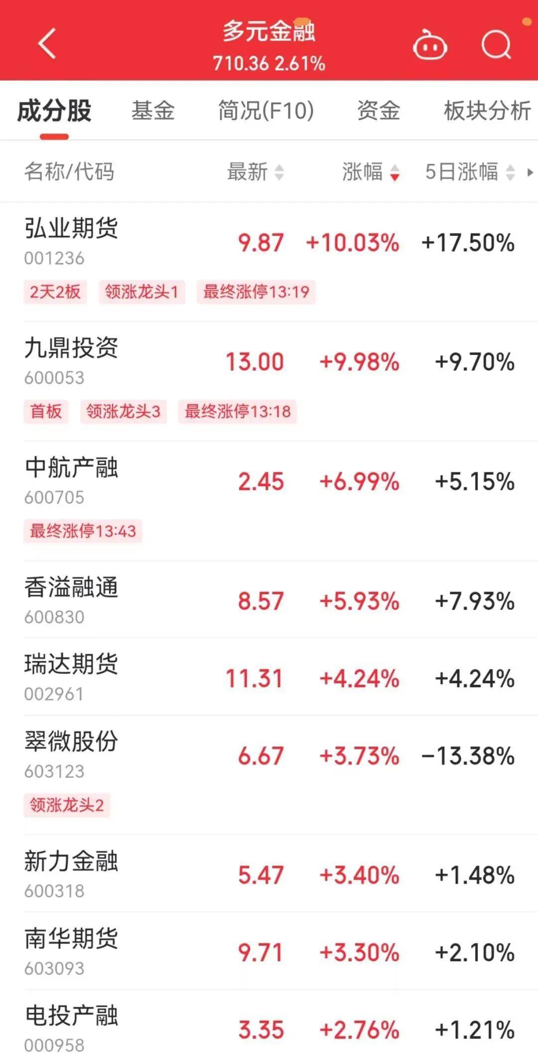 多元金融板块方面,午后13:18至13:19,一分钟内,弘业期货、九鼎投资直线拉升涨停,中航产融、香溢融通、瑞达期货、翠微股份等跟涨。