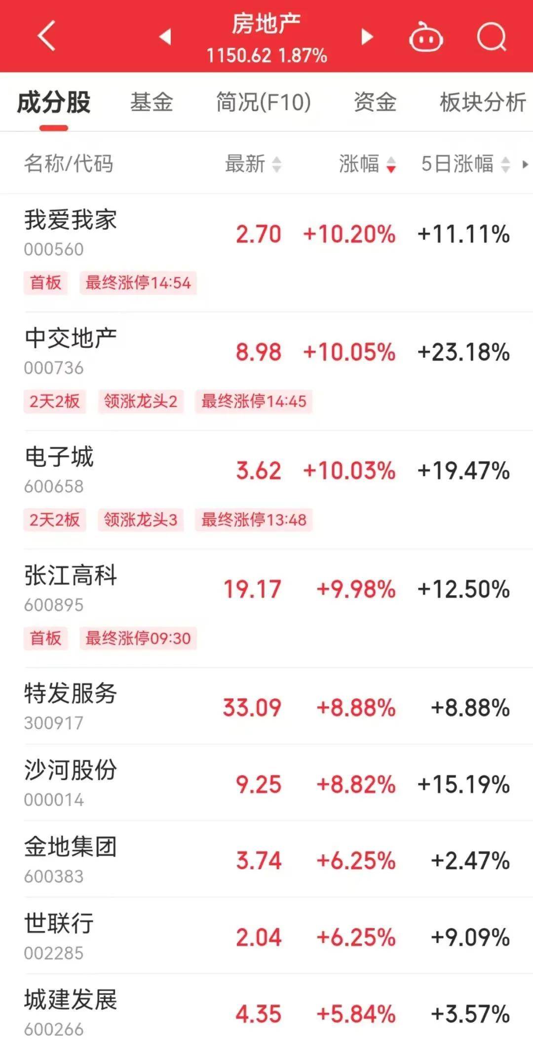 午后,A股地产板块走强并领涨市场。我爱我家、中交地产、电子城、张江高科涨停,特发服务、空港股份、金地集团、世联行等跟涨。