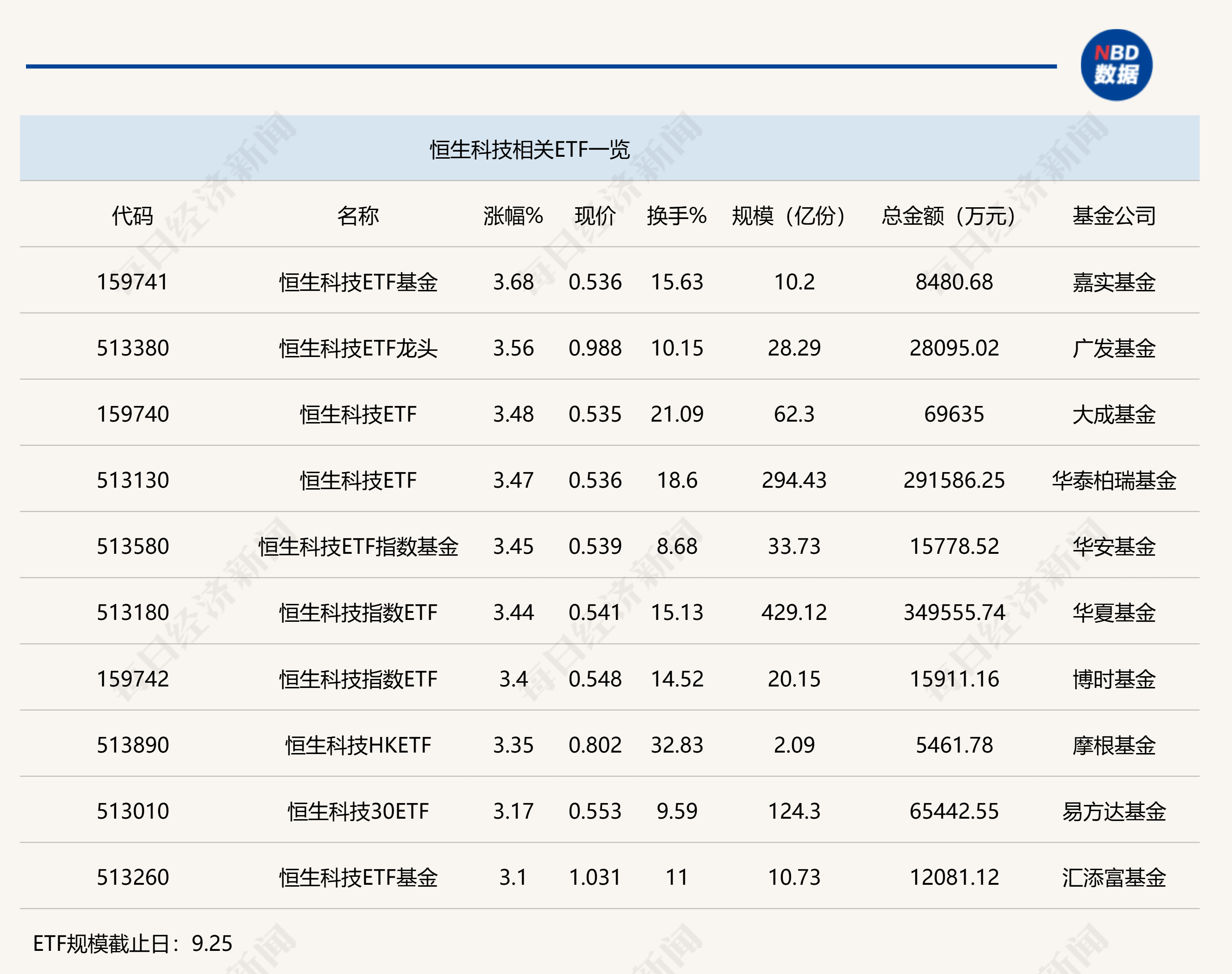 点评:恒生科技ETF基金(159741)和恒生科技ETF龙头(513380)今日上午分别上涨3.68%和3.56%,其中,恒生科技ETF龙头(513380)规模相对较大,达到28.29亿份,半日成交金额为2.81亿元,上述两只ETF追踪的是恒生科技指数,追踪该指数的ETF还包括恒生科技ETF(159740)、恒生科技ETF(513130)、恒生科技指数ETF(513180)等。其中, 恒生科技指数ETF(513180)规模最大,达到429亿份,半日成交金额高达34.96亿元。