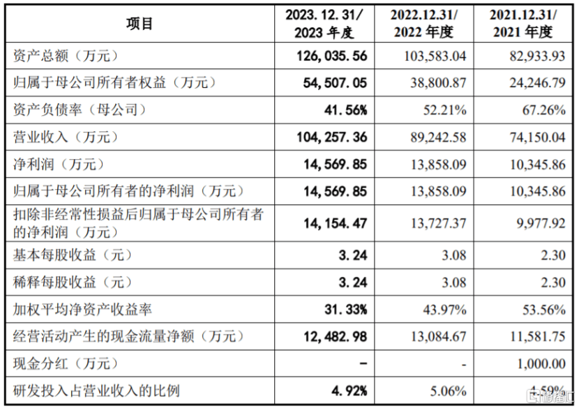 业绩方面,2021年、2022年、2023年,江顺科技的营业收入分别约7.42亿元、8.92亿元、10.43亿元,对应的净利润分别约1.03亿元、1.39亿元、1.46亿元。