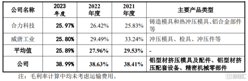 报告期内,江顺科技的综合毛利率分别为38.41%、38.63%和38.99%,公司毛利率明显高于同行业可比公司平均值,公司称,一方面由于模具作为下游行业的重要生产配套产品,其价格、毛利率等因所成型产品不同、下游应用不同、生产工艺不同等存在差异,使得模具产品的定价、生产成本也存在一定差异;另一方面各公司产品结构存在一定差异。