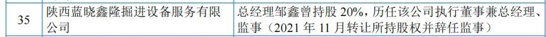 招股书显示,邹威文、穆倩的儿子邹鑫出生于1994年4月。2016年至2019年,邹鑫出任科隆新材神南分公司总经理,兼任陕西蓝晓鑫隆掘进设备服务有限公司(以下简称“蓝晓鑫隆”)执行董事兼总经理。2019年至2021年,邹鑫在蓝晓鑫隆担任监事。