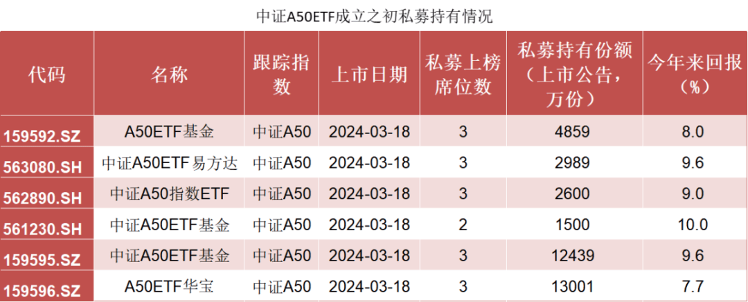 另外,跟踪中证A50的10只ETF今年合计净流入超250亿,而这10只基金均成立于今年3月份。