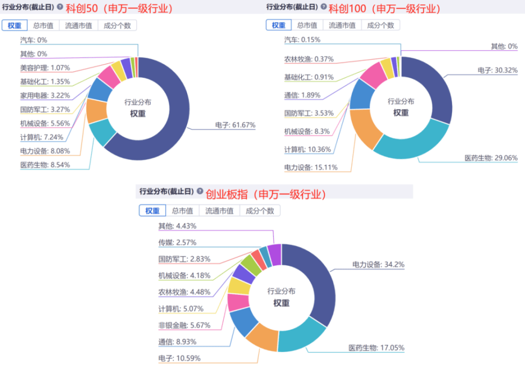 简单从指数行业权重分布来看,科创50=电子(62%)+其它,即主要以半导体为主;科创100=电子(30%)+医药(29%)+电力设备(15%),属于“半导体+医药+新能源”三足鼎立状况;创业板指=电力设备(34%)+医药(17%)+其它,约等于“新能源+医药”。