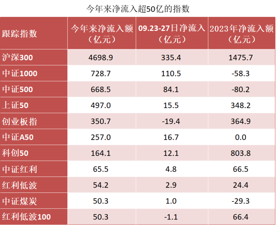其次是跟踪中证1000和中证500的指数产品,去年这两类资产被资金抛弃。今年来都被干了约700亿,而且这俩是上周除了沪深300外,资金主攻的两大方向。