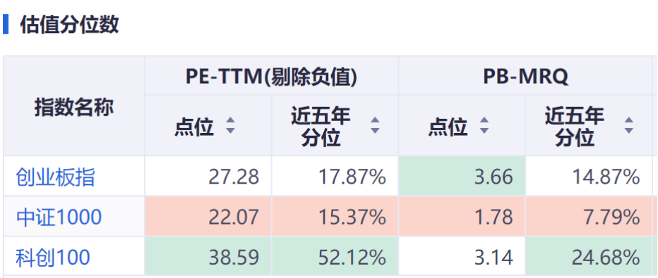 从近五年的PE/PB估值分位来看,创业板指、中证1000目前仍处于历史相对低位,科创100指数是去年8月份发布的,成立时间尚短,估值参考意义有限。