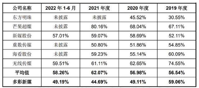 值得注意的是,2019年至2021年,多彩新媒核心业务IPTV业务毛利率逐年下降,分别为59.06%、49.11%和44.69%;而同行业可比公司平均数则逐年上涨,分别为56.54%、56.98%和62.07%。