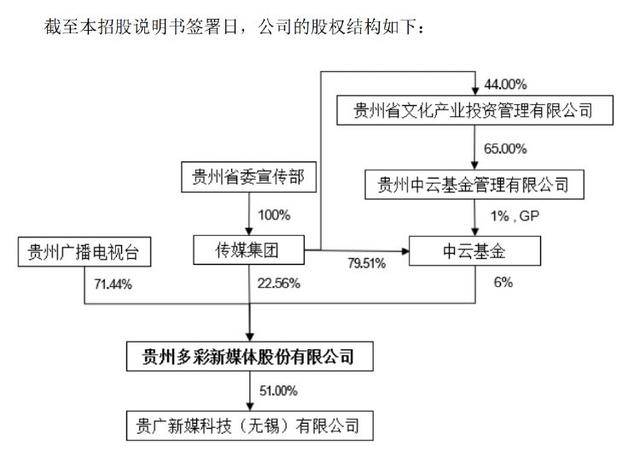 股东方面,截至招股说明书签署日,贵州广播电视台直接持有多彩新媒4286.40万股股份,占公司总股本的比例为71.44%,为公司的控股股东和实际控制人。