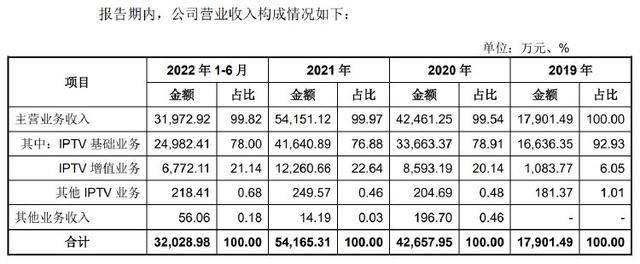 据招股书,报告期内多彩新媒IPTV业务收入分别为1.79亿元、4.25亿元、5.42亿元和3.197亿元,占公司当期业务收入比例分别为100.00%、99.54%、99.97%和99.82%,占比相当的高。