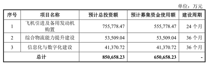 值得留意的是募资规模,根据2023年3月的申报稿,最初国货航预计募资65.07亿元,将投入“飞机引进及备用发动机购置”55.58亿元,建设期24个月;投入到“综合物流能力提升建设”5.35亿元,建设期36个月;投入到“信息化与数字化建设”4.14亿元,建设期36个月。